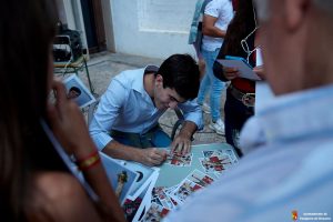 Al final de la clase, varios vecinos se animaron a demostrar sus dotes con “los tratos” después de lo aprendido. Para finalizar, Cid de María firmó y dedicó fotos a todo el que así lo quiso, dando por concluido el acto con un aperitivo preparado por la asociación que lleva su nombre.