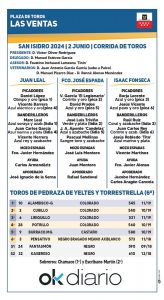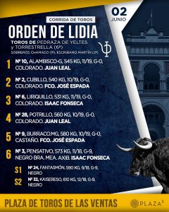 02 Jun ActualidadCinco de Pedraza de Yeltes y uno de Torrestrella para hoy en Las Ventas Posted on 02/06/202402/06/2024 by Redacción Vigésimo primer festejo de San Isidro que anuncia a Juan Leal, Francisco José Espada e Isaac Fonseca frente a ejemplares de Pedraza de Yeltes y Torrestrella (6º) Orden de lidia, cuadrillas y fotos de los toros Cinco de Pedraza de Yeltes y uno de Torrestrella para hoy en Las Ventas Cinco de Pedraza de Yeltes y uno de Torrestrella para hoy en Las Ventas Cinco de Pedraza de Yeltes y uno de Torrestrella para hoy en Las Ventas Cinco de Pedraza de Yeltes y uno de Torrestrella para hoy en Las Ventas Cinco de Pedraza de Yeltes y uno de Torrestrella para hoy en Las Ventas Cinco de Pedraza de Yeltes y uno de Torrestrella para hoy en Las Ventas Cinco de Pedraza de Yeltes y uno de Torrestrella para hoy en Las Ventas Cinco de Pedraza de Yeltes y uno de Torrestrella para hoy en Las Ventas Vídeo Fotos y Vídeo: Plaza 1 Redacción Corrida mixta por el 75º Aniversario de la Plaza de Medina del Campo Orden de lidia para el mano a mano de Cáceres
