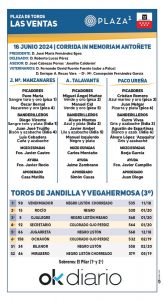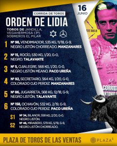 Esta tarde se celebra la Corrida In Memoriam de Antoñete en la Plaza de Toros de Las Ventas. Se lidian astados de Jandilla y Vegahermosa (3º) para una terna compuesta por José María Manzanares, Alejandro Talavante y Paco Ureña
