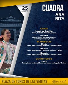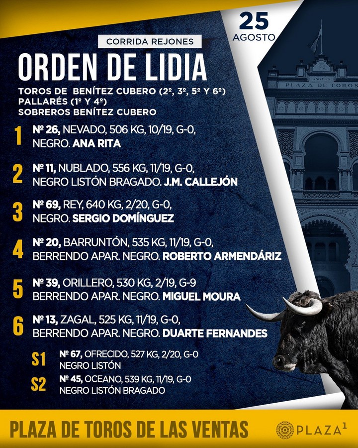 La Plaza de Las Ventas acoge esta tarde la segunda corrida de toros de este mes de agosto. En ella, se lidiarán reses de Benítez Cubero y Pallarés para Ana Rita, que confirmará alternativa, José Miguel Callejón, Sergio Domínguez, Roberto Armendáriz, Miguel Moura y Duarte Fernandes