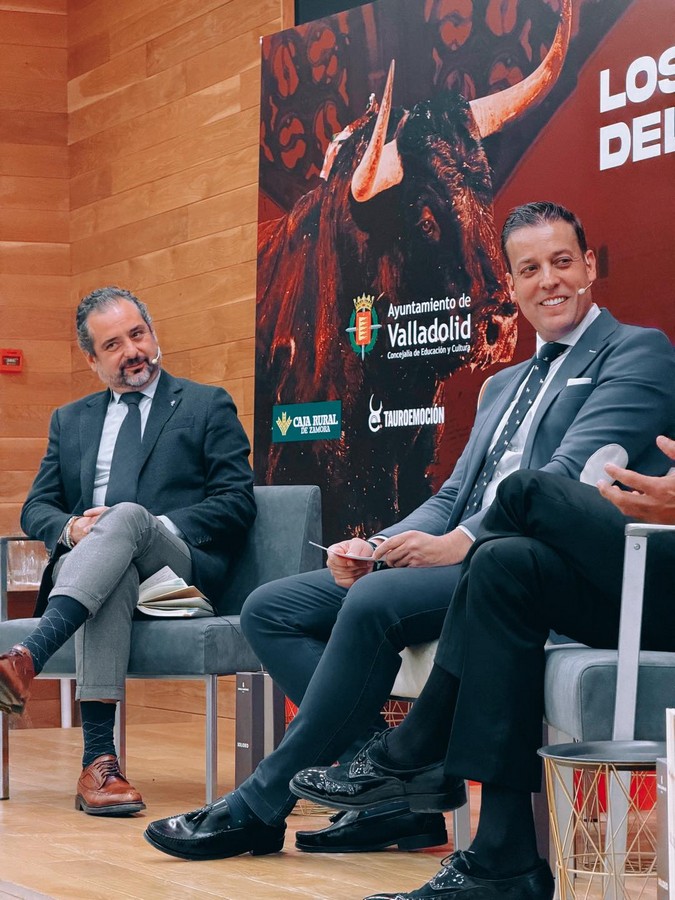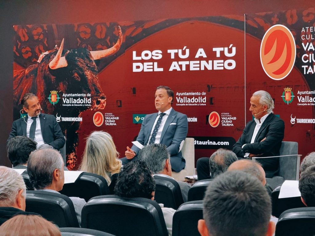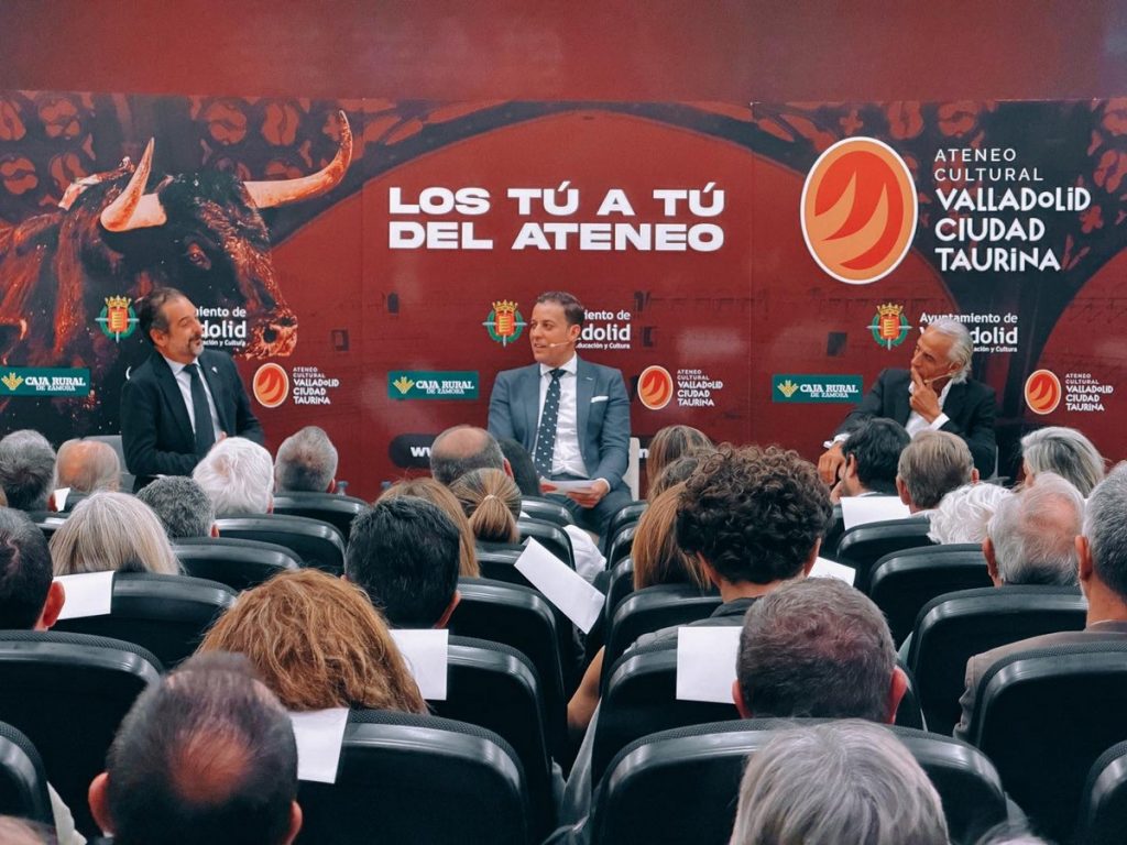 Toros y vino ha sido el hilo conductor de una nueva edición de “Los tú a tú del Ateneo” con el matador de toros, David Luguillano, y el propietario de la bodega Dehesa de los Canónigos, Iván Sanz, en Valladolid.