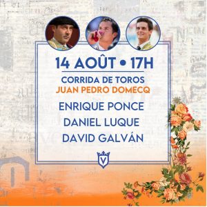 Miércoles 14 de agosto: 17:00 horas. Toros de Juan Pedro Domecq para Enrique Ponce, Daniel Luque y David Galván.