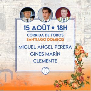 Jueves 15 de agosto: 18:00 horas. Astados de Santiago Domecq para Miguel Ángel Perera, Ginés Marín y Clemente.