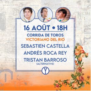 Viernes 16 de agosto: 18:00 horas. Ejemplares de Victoriano del Río para Sebastián Castella, Andrés Roca Rey y la alternativa de Tristán Barroso.