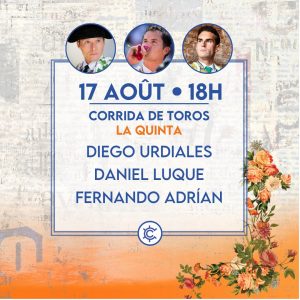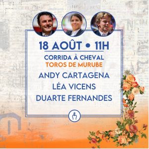 Domingo 18 de agosto: 11:00 horas. Corrida de rejones. Animales de Murube para Andy Cartagena, Lea Vicens y Duarte Fernandes.