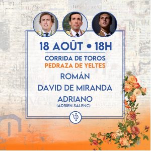 Domingo 18 de agosto: 18:00 horas. Toros de Pedraza de Yeltes para Román, David de Miranda y Adrien Salenc «Adriano».