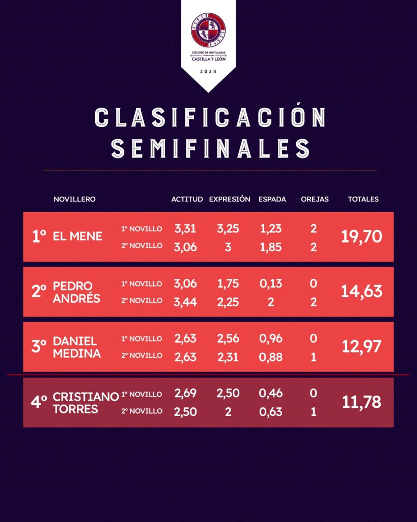 Este pasado sábado se celebró en Herrera de Pisuerga la segunda y última semifinal del Circuito de Castilla y León 2024. Cristiano Torres, quien cortó una oreja y El Mene, quien se llevó 4 trofeos, cerraron la fase de semifinales. Tras la deliberación del jurado, El Mene se convierte en el triunfador de la tarde y en el segundo finalista del certamen, con 19,70 puntos. Por su parte, Cristiano Torres cierra la tabla clasificatoria, quedándose fuera de la final, tras obtener 11,78 puntos.