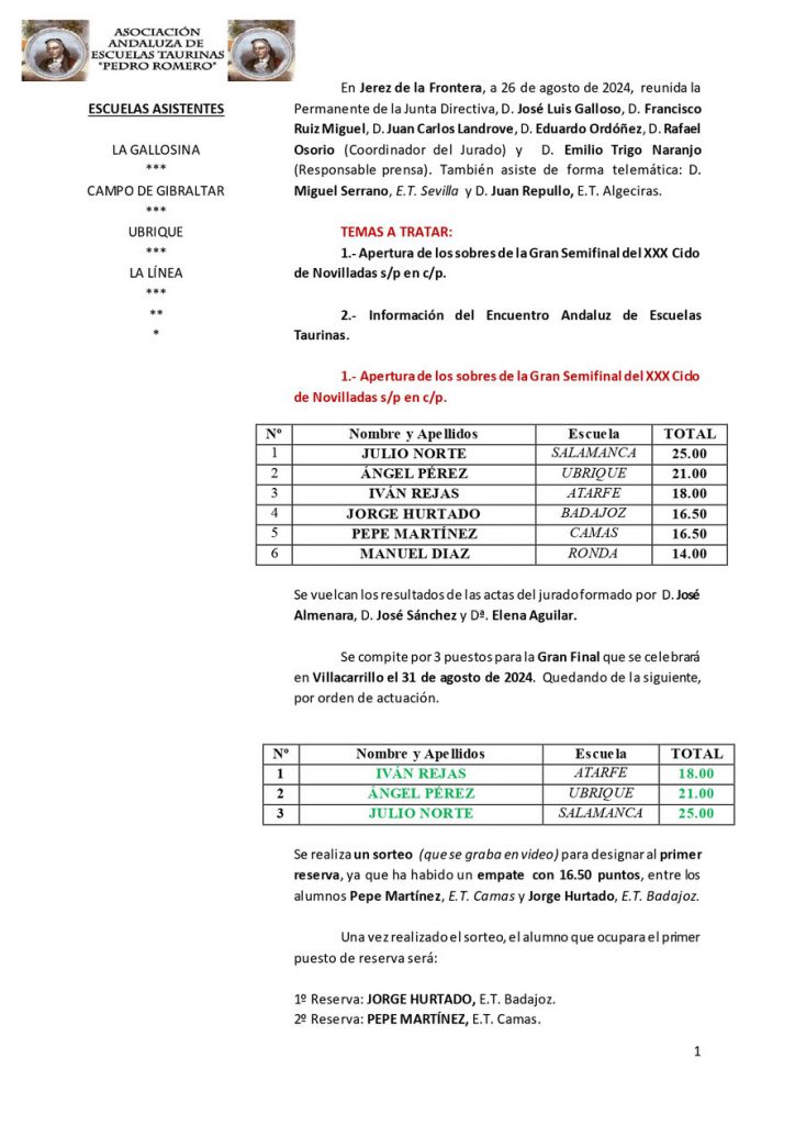 En Jerez de la Frontera, a 26 de agosto de 2024, reunida la Permanente de la Junta Directiva, D. José Luis Galloso, D. Francisco Ruiz Miguel, D. Juan Carlos Landrove, D. Eduardo Ordóñez, D. Rafael Osorio (Coordinador del Jurado) y D. Emilio Trigo Naranjo (Responsable prensa). También asiste de forma telemática: D. Miguel Serrano, E.T. Sevilla y D. Juan Repullo, E.T. Algeciras.