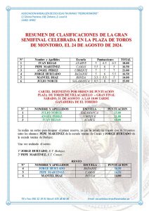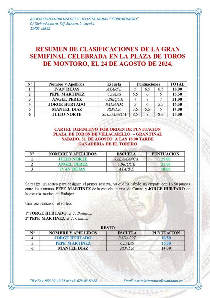 Después de las puntuaciones del jurado de la ‘Gran Semifinal’ de Montoro que tuvo lugar el pasado sábado, los finalistas son Iván Rejas (Escuela Taurina de Atarfe), Ángel Pérez (Escuela Taurina Comarcal de Ubrique) y Julio Norte (Escuela Taurina de Salamanca).