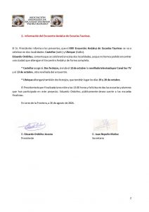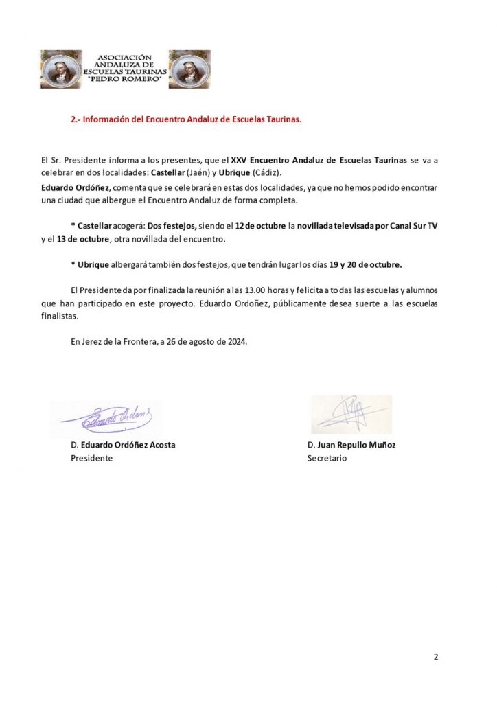 El Sr. Presidente informa a los presentes, que el XXV Encuentro Andaluz de Escuelas Taurinas se va a celebrar en dos localidades: Castellar (Jaén) y Ubrique (Cádiz). Eduardo Ordóñez, comenta que se celebrará en estas dos localidades, ya que no hemos podido encontrar una ciudad que albergue el Encuentro Andaluz de forma completa.
