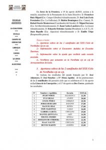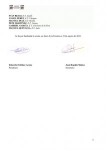 En Jerez de la Frontera, a 19 de agosto de2024, asisten a la reunión, miembros de la Permanente de la Junta Directiva: D. Francisco Ruiz Miguel (Esc. Campo Gibraltar) telemáticamente, D. José Luis Feria Fernández ‘José Luis Galloso’ (Esc. La Gallosina), D. Rubén Domínguez (Esc. Camas), D. Rafael Osorio Monterroso (Coordinador del Jurado), D. Miguel Serrano (Esc. Sevilla) telemáticamente, D. Juan Carlos Landrove (Esc. La Línea) telemáticamente, D. Eduardo Ordoñez Acosta (Presidente A.A.E.T.), D. Juan Repullo (Esc. Algeciras) telemáticamente y D. Emilio Trigo (Responsable prensa).