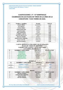 Se vuelcan los resultados del jurado formado por D. José Almenara, D. José Sánchez y Dª. Elena Aguilar, de las puntuaciones de las 2 semifinales del presente ciclo que se celebraron el 11 de agosto en La Línea de la Concepción y el 17 de agosto en Dos Torres, quedando los resultados: