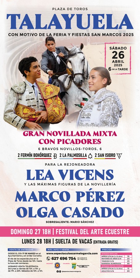 Junto a Lea Vicens, trenzarán el paseíllo dos novilleros con nombre propio dentro del escalafón, como son Marco Pérez y Olga Casado. El salmantino Marco Pérez actuará en Talayuela dentro de esta crucial temporada para él, en la que hará su presentación tanto en la Real Maestranza de Sevilla como en la Feria de San Isidro en Madrid, antes de tomar la alternativa en Nimes al lado de Morante de la Puebla y Alejandro Talavante.