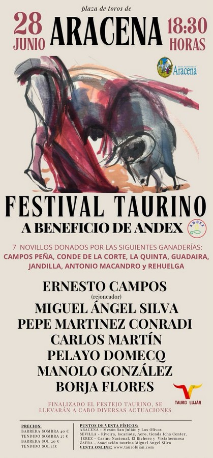 El cartel fue presentado por D. Luis Ybarra Halcón, que animó a todos aquellos que puedan a asistir el próximo sábado 28 de junio a Aracena. Se vivirá una tarde única, de intensas emociones. Seguidamente habló el presidente de la Fundación Andex, D. Luis Manuel Halcón Guardiola, que agradeció el apoyo a los novilleros y a los ganaderos, por su trabajo y dedicación con la causa. Por último, tomó la palabra Dña. Silvia Duran, teniente de alcalde del Ayuntamiento de Aracena.