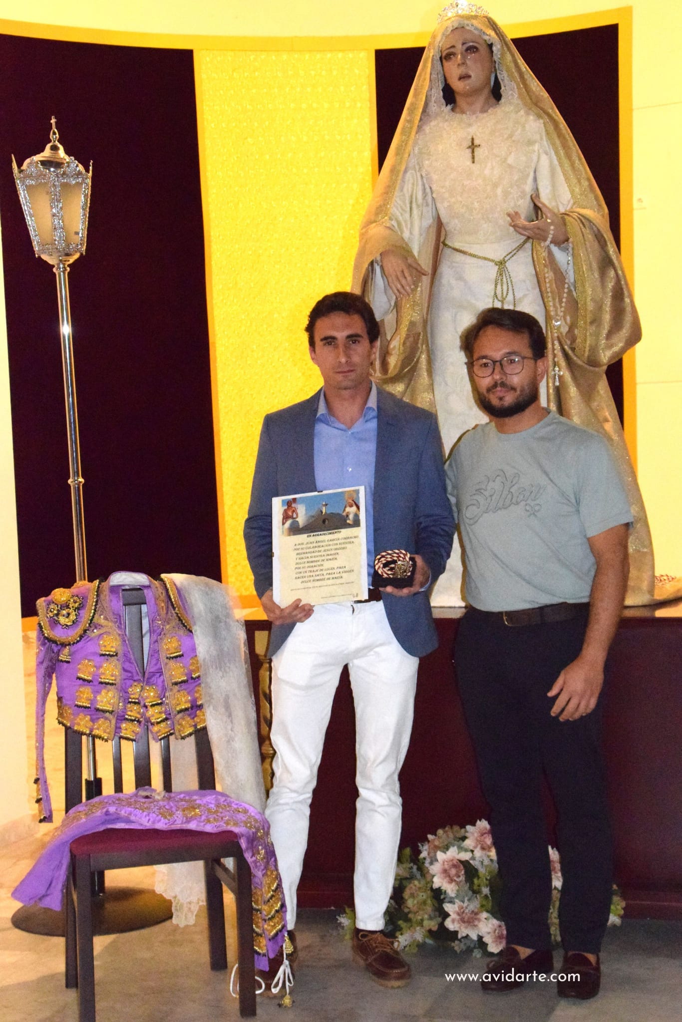 El novillero Juan Ángel García Corbacho ha tenido un hermoso gesto con la Hermandad de Jesús Obrero y Dulce Nombre de María de Badajoz. Hace unos días, le hizo entrega de un vestido de torear de un enorme valor sentimental, no en vano le ha acompañado durante varios años de su carrera, enfundado en él ha cosechado importantes triunfos así como también ha sufrido algún percance, como el producido el pasado año en la Feria del Arroz de Calasparra. La segunda piel de los toreros, los vestidos de torear, que saben bien los miedos, incertidumbres, dudas, alegrías y tristezas que conlleva la profesión. Por eso, es tan difícil desprenderse de ellos, porque son parte de la vida de cada torero.