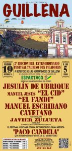 Se lidiarán reses de Juan Antonio Ruiz ‘Espartaco’, para Jesús Janeiro ‘Jesulín de Ubrique’, Manuel Jesús ‘El Cid’, David Fandila ‘El Fandi’, Manuel Escribano, Cayetano y el novillero Javier Zulueta. El festival será amenizado con la actuación en directo del artista Paco Candela. El sábado 19 de octubre, a las 17:00 horas, “el toreo y el cante” se volverán a unir por una causa noble y en esta ocasión será para las cuatro Hermandades de Guillena