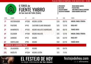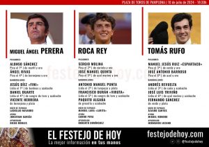 La Plaza Monumental de Pamplona acoge esta tarde la cuarta corrida de toros de la Feria de San Fermín. Se lidian astados de Fuente Ymbro para Miguel Ángel Perera, Andrés Roca Rey y Tomás Rufo