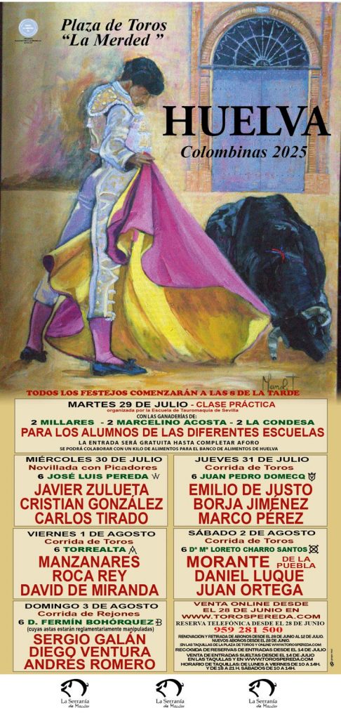 Para comenzar, la empresa Toros La Merced “vuelve a apostar fuerte por los jóvenes valores de la Tauromaquia, organizando por cuarta vez el Certamen para novilleros sin caballos ‘Huelva es Torera. Objetivo La Merced’. En cuanto a la novillada picada, regresa a Huelva el triunfador del año pasado, Javier Zulueta, que tomará la alternativa en la próxima Feria de San Miguel de Sevilla, que alternará con una firme promesa del toreo salmantina, Cristian González, y el novillero de Ayamonte y ganador del Circuito de Andalucía 2025, Carlos Tirado, que debutó con los del castoreño en Las Colombinas del pasado año”.