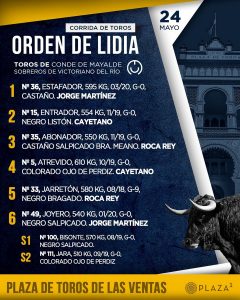 En el decimotercer festejo de la Feria de San Isidro confirmará su alternativa el diestro Jorge Martínez, de manos de Cayetano y en presencia de Roca Rey, lidiándose ejemplares de Conde de Mayalde