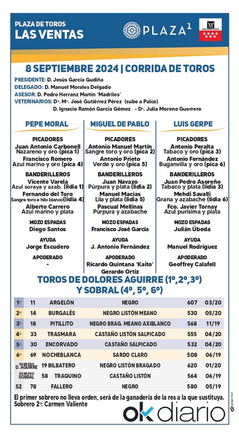La Plaza de Las Ventas vivirá esta tarde un nuevo desafío ganadero, en este caso entre las divisas de Dolores Aguirre y Sobral. En el cartel se anuncian Pepe Moral, David Galván e Isaac Fonseca