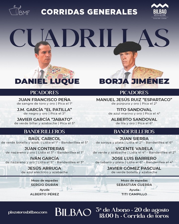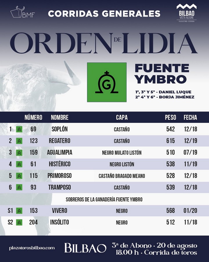 La Aste Nagusia de Bilbao vive esta tarde su primera corrida de toros. Saltarán al ruedo de Vista Alegre ejemplares de Fuente Ymbro para un interesante mano a mano entre Daniel Luque y Borja Jiménez