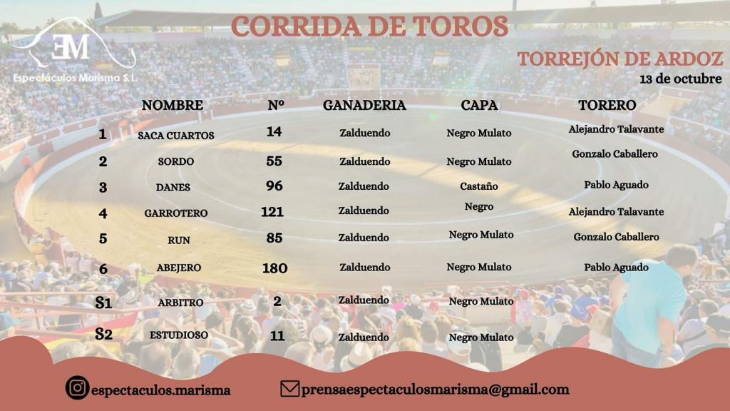 13 Oct ActualidadLos astados de Zalduendo para la corrida de Torrejón Posted on 13/10/202413/10/2024 by Redacción Los astados de la ganadería de Zalduendo que saltarán esta tarde al coso madrileño de Torrejón de Ardoz en la III Corrida a favor de la Fundación ‘La Sonrisa de María’ Orden de lidia y cuadrillas Los astados de Zalduendo para la corrida de Torrejón Los astados de Zalduendo para la corrida de Torrejón Los astados de Zalduendo para la corrida de Torrejón Espectáculos Marisma Redacción Orden de lidia para la 1ª corrida de la Feria de Jaén Los toros para la corrida de rejones que cierra Zaragoza