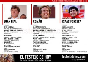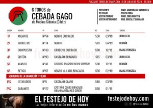 08 Jul ActualidadLos de Cebada Gago para hoy en Pamplona Posted on 08/07/202408/07/2024 by Redacción Los toros de Cebada Gago saltarán al ruedo de Pamplona en la segunda corrida de la Feria de San Fermín. Frente a ellos Juan Leal, Román e Isaac Fonseca Orden de lidia y cuadrillas Los de Cebada Gago para hoy en Pamplona Los de Cebada Gago para hoy en Pamplona Información: El Festejo de Hoy Foto: Casa de Misericordia de Pamplona Redacción Borja Jiménez pasa la noche con dolores pero sin fiebre Presentada la primera edición del Circuito Valenciano de Novilladas