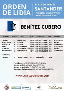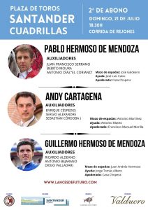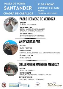 Segundo capítulo de la Feria de Santiago de Santander 2024. Turno para la corrida de rejones, en la que harán el paseíllo Pablo Hermoso de Mendoza, Andy Cartagena y Guillermo Hermoso de Mendoza, que se enfrentarán a animales de Benítez Cubero