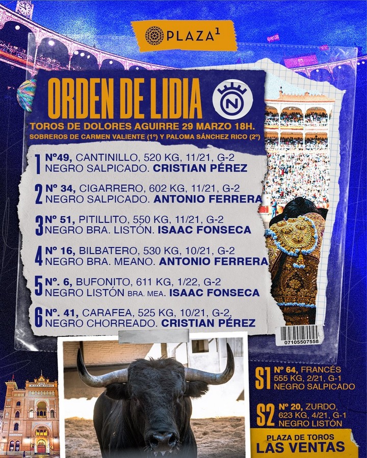 29 Mar ActualidadLos ejemplares de Dolores Aguirre para hoy en Madrid Posted on 29/03/202629/03/2026 by Redacción Los ejemplares de Dolores Aguirre para hoy en Madrid Los toros de la divisa sevillana serán lidiados por Antonio Ferrera, Isaac Fonseca y Cristian Pérez, que confirma alternativa Orden de lidia y fotos de los toros Los ejemplares de Dolores Aguirre para hoy en Madrid Los ejemplares de Dolores Aguirre para hoy en Madrid Los ejemplares de Dolores Aguirre para hoy en Madrid Los ejemplares de Dolores Aguirre para hoy en Madrid Cuadrillas HOJA29MARZO Vídeo Redacción Toreo de salón en el centro penitenciario Sevilla III Seis de Couto de Fornilhos para abrochar la Feria de Almendralejo