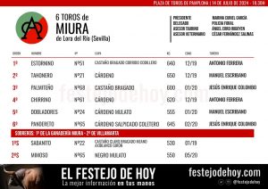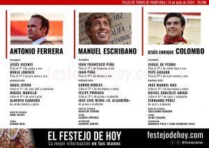 14 Jul ActualidadLos ‘Miuras’ para el cierre de la Feria de San Fermín Posted on 14/07/202414/07/2024 by Redacción Esta tarde concluye la Feria de San Fermín de Pamplona con los toros de Miura. En el cartel figuran los diestros Antonio Ferrera, Manuel Escribano y Jesús Enrique Colombo Orden de lidia y cuadrillas Los 'Miuras' para el cierre de la Feria de San Fermín Los 'Miuras' para el cierre de la Feria de San Fermín El Festejo de Hoy Imagen: Pablo Sánchez Redacción Reseña de la Corrida del Rejón de Oro en Mejanes Puerta grande para Jesús Enrique Colombo con los ‘Miuras’ en Pamplona