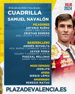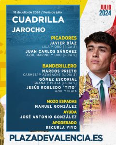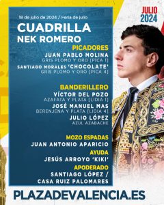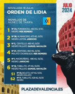 18 Jul ActualidadLos novillos de Núñez de Tarifa que abren la Feria de Julio de Valencia Posted on 18/07/202418/07/2024 by Redacción Esta tarde comienza la Feria de Julio de Valencia con una novillada picada. Se van a lidiar utreros de la ganadería de Núñez de Tarifa por parte de Nek Romero, Jarocho y Samuel Navalón Orden de lidia y cuadrillas Los novillos de Núñez de Tarifa que abren la Feria de Julio de Valencia Los novillos de Núñez de Tarifa que abren la Feria de Julio de Valencia Los novillos de Núñez de Tarifa que abren la Feria de Julio de Valencia Los novillos de Núñez de Tarifa que abren la Feria de Julio de Valencia Imágenes: Espacios Nautalia 360 Redacción Circuitos Taurinos anuncia una interesante feria en Navaluenga Los astados de El Cotillo y Hnos. Collado Ruiz para hoy en Las Ventas