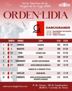 Esta tarde continuará la Feria de la Virgen de la Vega de Salamanca con una corrida de toros en la que se lidiarán astados de Garcigrande para una terna compuesta por Alejandro Talavante, Andrés Roca Rey y Pablo Aguado