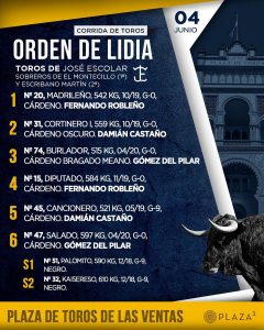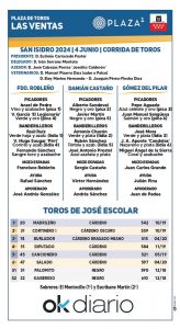 04 Jun ActualidadLos toros de José Escolar para hoy en Las Ventas Posted on 04/06/202404/06/2024 by Redacción La Feria de San Isidro entra en su última semana. Esta tarde se lidian astados de la ganadería de José Escolar para Fernando Robleño, Damián Castaño y Gómez del Pilar Orden de lidia, cuadrillas y fotos de los toros Los toros de José Escolar para hoy en Las Ventas Los toros de José Escolar para hoy en Las Ventas Los toros de José Escolar para hoy en Las Ventas Los toros de José Escolar para hoy en Las Ventas Los toros de José Escolar para hoy en Las Ventas Los toros de José Escolar para hoy en Las Ventas Los toros de José Escolar para hoy en Las Ventas Los toros de José Escolar para hoy en Las Ventas Vídeo Fotos y Vídeo: Plaza 1 Redacción Nace el Circuito de Novilladas de la Comunidad Valenciana Victoriano del Río se alza con el Premio al Mejor Toro de la Feria de Granada