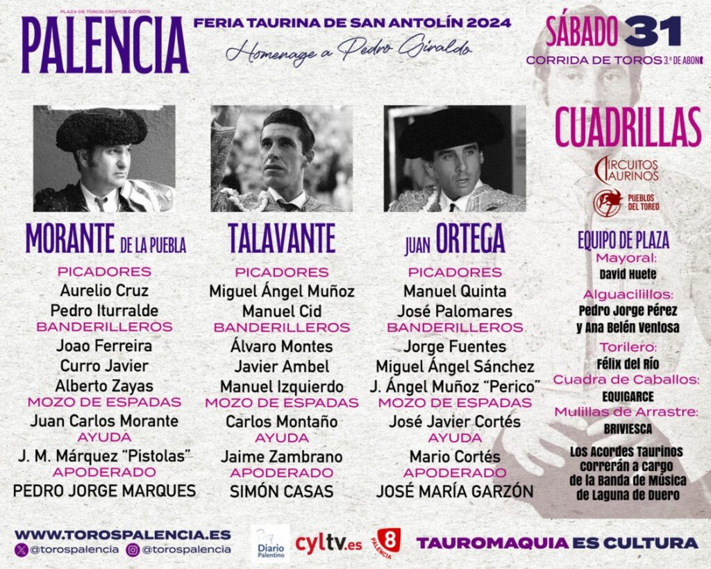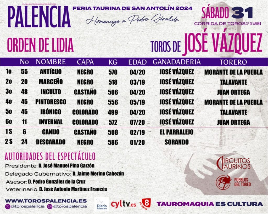 31 Ago ActualidadLos toros de José Vázquez para la tercera corrida de la Feria de Palencia Posted on 31/08/202431/08/2024 by Redacción La Feria de San Antolín de Palencia vive esta tarde su tercer capítulo. Morante de la Puebla, Alejandro Talavante y Juan Ortega darán cuenta de un encierro de José Vázquez Orden de lidia y cuadrillas Los toros de José Vázquez para la tercera corrida de la Feria de Palencia Los toros de José Vázquez para la tercera corrida de la Feria de Palencia Imágenes: Toros Palencia Redacción ‘Ordenado’, de Domínguez Camacho, toro de la alternativa de Pablo Atienza en Almazán Orden de lidia para la corrida de rejones que abre la Feria de Valladolid