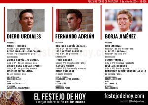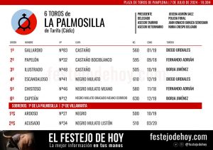 07 Jul ActualidadLos toros de La Palmosilla para la primera corrida de los Sanfermines Posted on 07/07/202407/07/2024 by Redacción Esta tarde se celebra la primera corrida de toros de la Feria de San Fermín 2024. Se lidian astados de La Palmosilla para Diego Urdiales, Fernando Adrián y Borja Jiménez Orden de lidia y cuadrillas Los toros de La Palmosilla para la primera corrida de los Sanfermines Los toros de La Palmosilla para la primera corrida de los Sanfermines El festejo de hoy Foto: Casa de Misericordia Redacción Dos orejas por coleta para Isaac Galvín y Miguel Vázquez en Almonaster la Real Sendas vueltas al ruedo para Jesús de la Calzada en Ceret