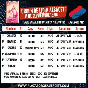 14 Sep ActualidadLos toros de Los Espartales para la de rejones de Albacete Posted on 14/09/202514/09/2025 by Redacción Los toros de Los Espartales para la de rejones de Albacete Se encargarán de su lidia Sergio Galán, que sustituye a Andy Cartagena, Diego Ventura y Lea Vicens Orden de lidia Los toros de Los Espartales para la de rejones de Albacete Redacción Listos los toros de Garcigrande para Salamanca Orden de lidia para el desafío ganadero de Las Ventas