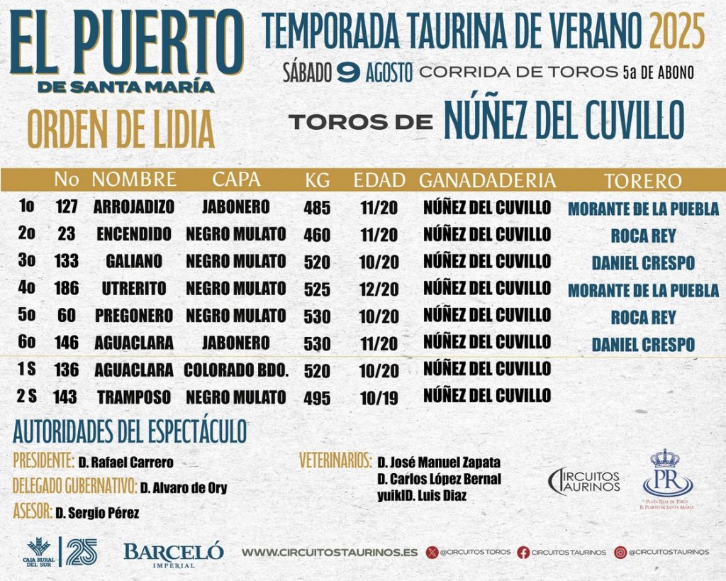Los seis toros de Núñez del Cuvillo que se lidiarán esta tarde en el quinto festejo de la Temporada de Verano de El Puerto de Santa María han sido sorteados y enchiquerados en los corrales de la Plaza Real.