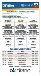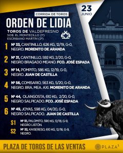 Primera cita en la Plaza de Las Ventas tras la Feria de San Isidro y las corridas de la Beneficencia y de In Memoriam. Se lidian astados de Valdefresno por parte de Morenito de Aranda, Francisco José Espada y Juan de Castilla