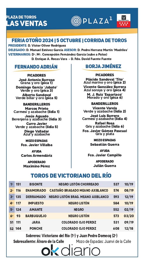 La Plaza de Las Ventas acoge esta tarde la tercera corrida de toros de la Feria de Otoño, en la que saldrán por chiqueros astados de Victoriano del Río para Fernando Adrián y Borja Jiménez, mano a mano