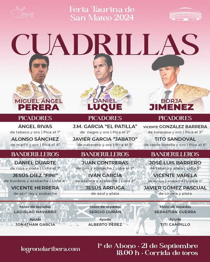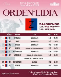 21 Sep ActualidadLos toros de Zalduendo para la primera de la Feria de San Mateo de Logroño Posted on 21/09/202421/09/2024 by Redacción Esta tarde comienza la Feria de San Mateo de Logroño. Esta primera corrida anuncia a los diestros Miguel Ángel Perera, Daniel Luque y Borja Jiménez frente a reses de Zalduendo Orden de lidia y cuadrillas Los toros de Zalduendo para la primera de la Feria de San Mateo de Logroño Los toros de Zalduendo para la primera de la Feria de San Mateo de Logroño Imágenes: BMF Toros Redacción ‘Sureño’, de Domingo Hernández, abre la encerrona de Tomás Rufo en Talavera Orden de lidia de los toros de Hnos. García Jiménez para hoy en Murcia