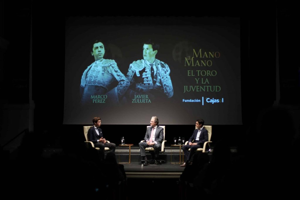 El Teatro Cajasol ha acogido el ‘Mano a Mano’ protagonizado por los jóvenes toreros Javier Zulueta y Marco Pérez, acompañados de José Enrique Moreno, moderador habitual de estos encuentros.