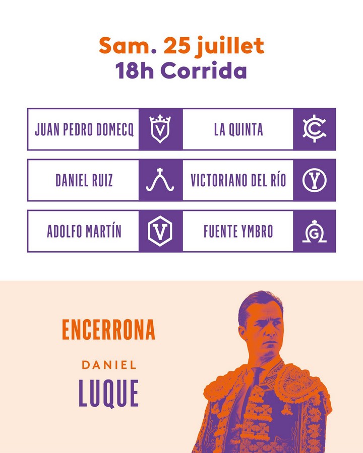 18:00 horas. Animales de Juan Pedro Domecq, La Quinta, Daniel Ruiz, Victoriano del Río, Adolfo Martín y Fuente Ymbro para Daniel Luque en solitario.