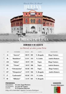 “Jaecero”, de Fermín Bohórquez, abrirá la tarde en el Coso de La Merced. Sorteados los toros de la ganadería de Fermín Bohórquez para el sexto festejo de la Feria de Las Colombinas 2024. Trenzarán el paseíllo en Huelva, Diego Ventura y Andrés Romero. (Mano a Mano)
