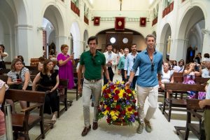 Los componentes del festival taurino benéfico de esta tarde realizan una ofrenda floral a la Blanca Paloma