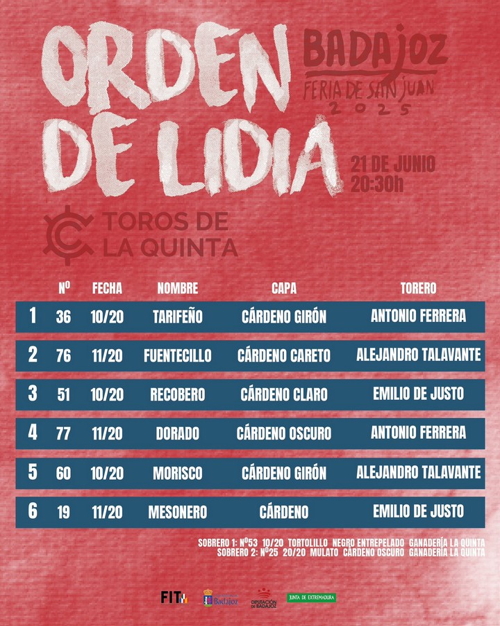 Orden de lidia de los astados de La Quinta para Badajoz