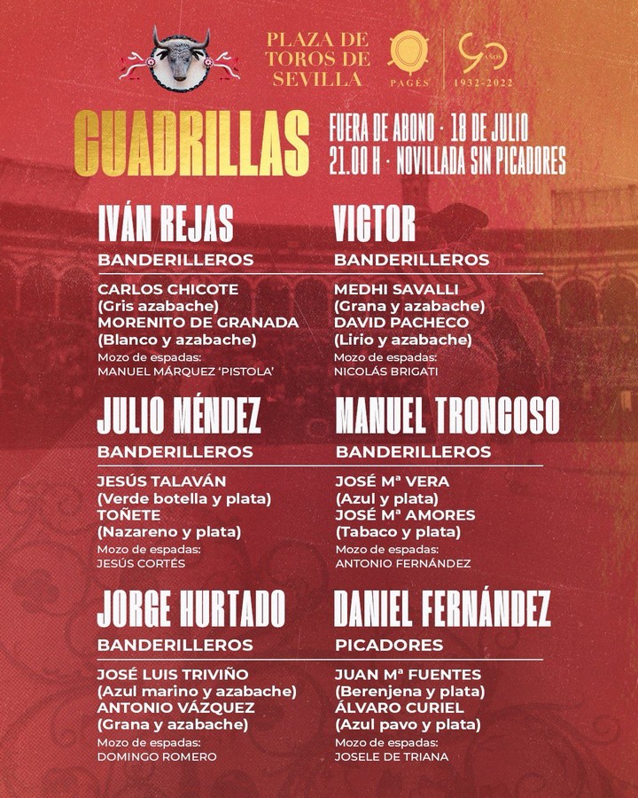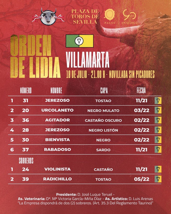 Esta noche tendrá lugar la última de las novilladas de promoción clasificatorias que cada jueves del mes de julio se celebran en la Maestranza de Sevilla. Ante reses de Villamarta actuarán Iván Rejas, Víctor, Julio Méndez, Manuel Troncoso, Jorge Hurtado y Daniel Fernández