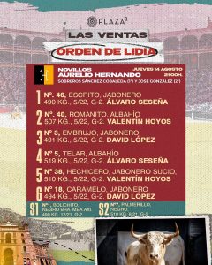 Orden de lidia de los novillos de Aurelio Hernando para Madrid