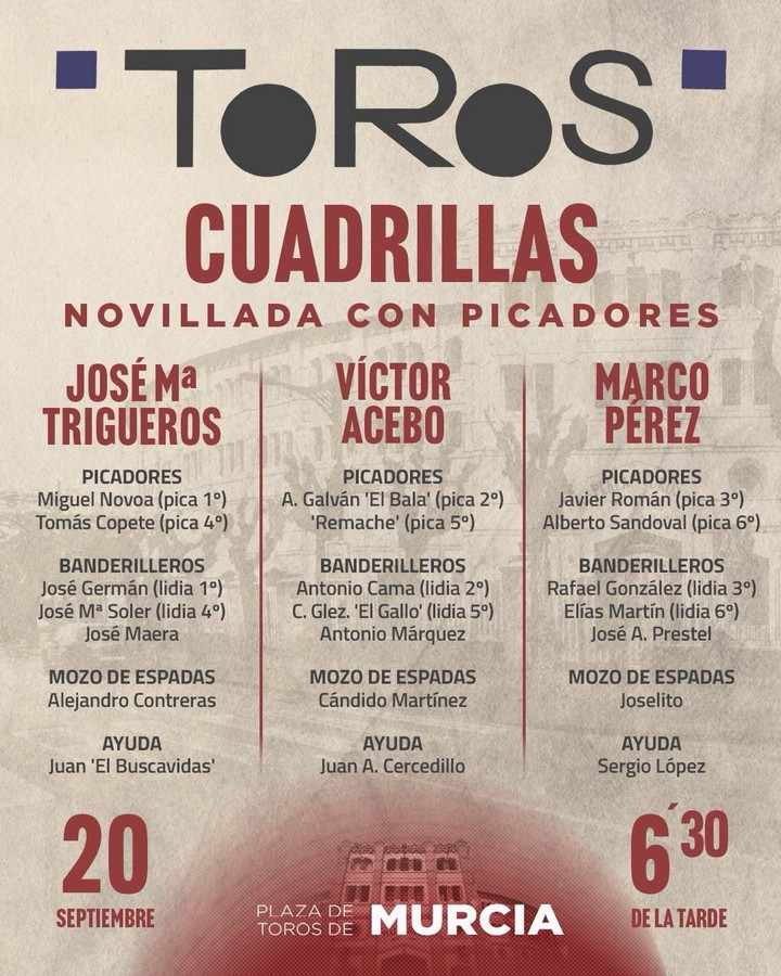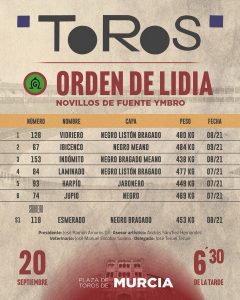 20 Sep ActualidadOrden de lidia de los novillos de Fuente Ymbro para esta tarde en Murcia Posted on 20/09/202420/09/2024 by Redacción Esta tarde se reanuda la Feria de Murcia con una novillada picada, en la que José María Trigueros, Víctor Acebo y Marco Pérez se enfrentarán a ejemplares de Fuente Ymbro Orden de lidia y cuadrillas Orden de lidia de los novillos de Fuente Ymbro para esta tarde en Murcia Orden de lidia de los novillos de Fuente Ymbro para esta tarde en Murcia Toromedia Comunicación Redacción Los toros de Garcigrande para hoy en Salamanca Sorteados los de María Loreto Charro para Almodóvar del Campo