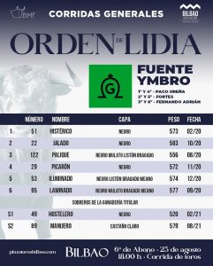 Orden de lidia de los toros de Fuente Ymbro para Bilbao
