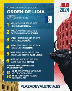 Orden de lidia de los toros de Santiago Domecq que cierran la Feria de Julio